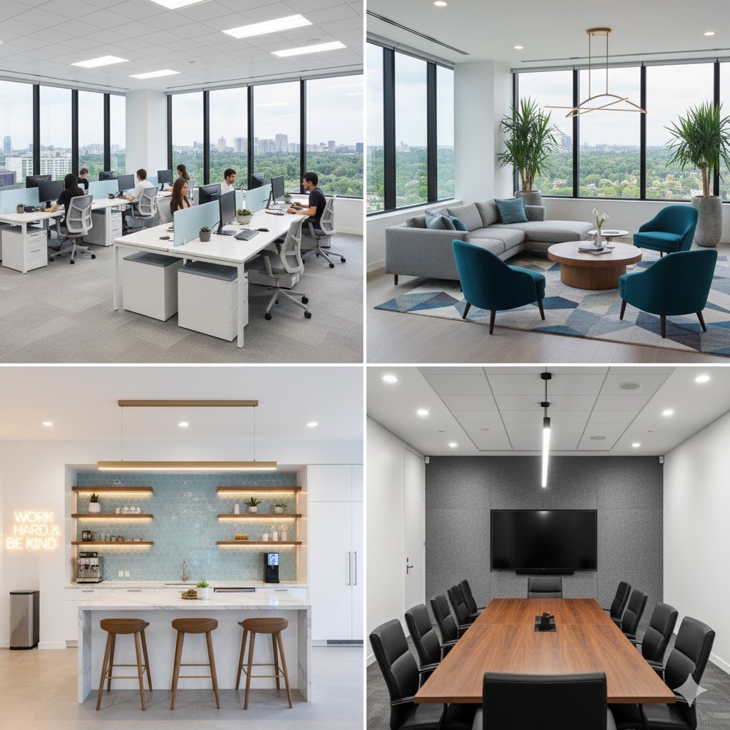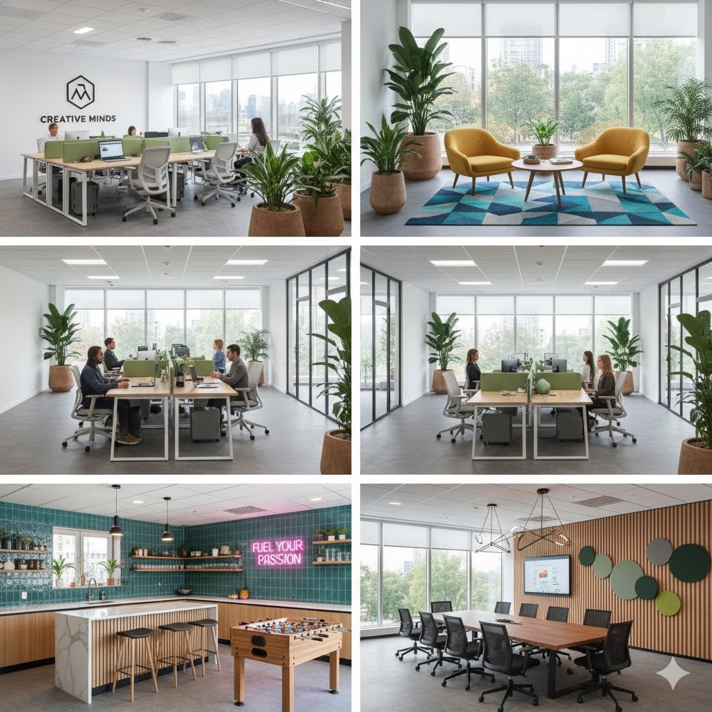 - Ánh sáng Tự nhiên: Tận dụng tối đa ánh sáng mặt trời thông qua các cửa sổ kính lớn, vách ngăn kính. Ánh sáng tự nhiên được chứng minh là tăng năng suất và cải thiện tâm trạng nhân viên.