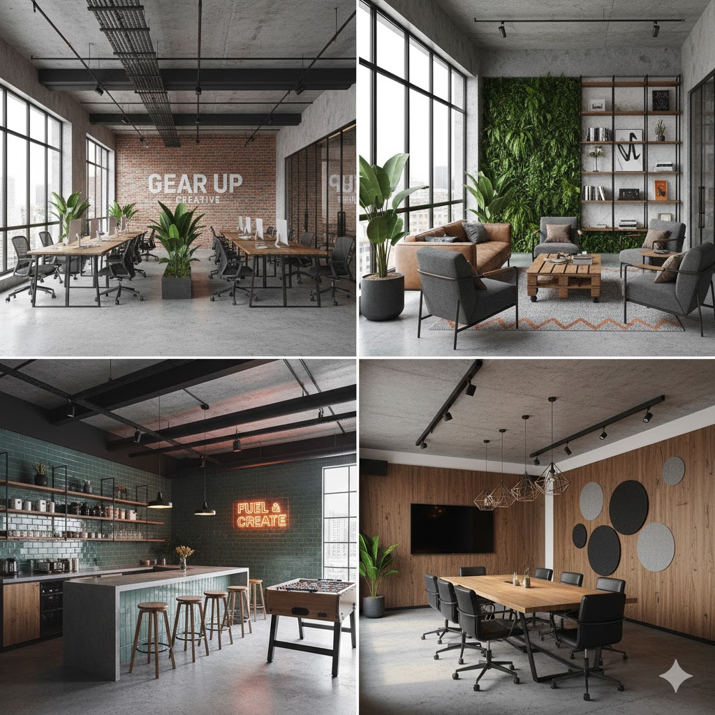 - Collaboration Area: Khu vực hợp tác mở, sử dụng ghế sofa, bàn cao/bàn tròn để dễ dàng thảo luận nhanh.