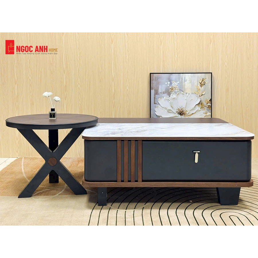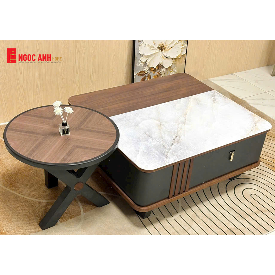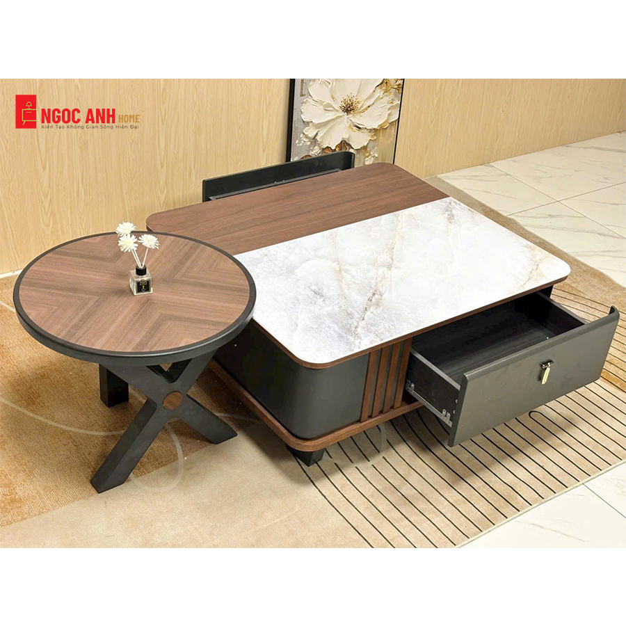 Mẫu bàn trà này nổi bật với sự kết hợp hài hòa của các chất liệu cao cấp và kiểu dáng độc đáo:
