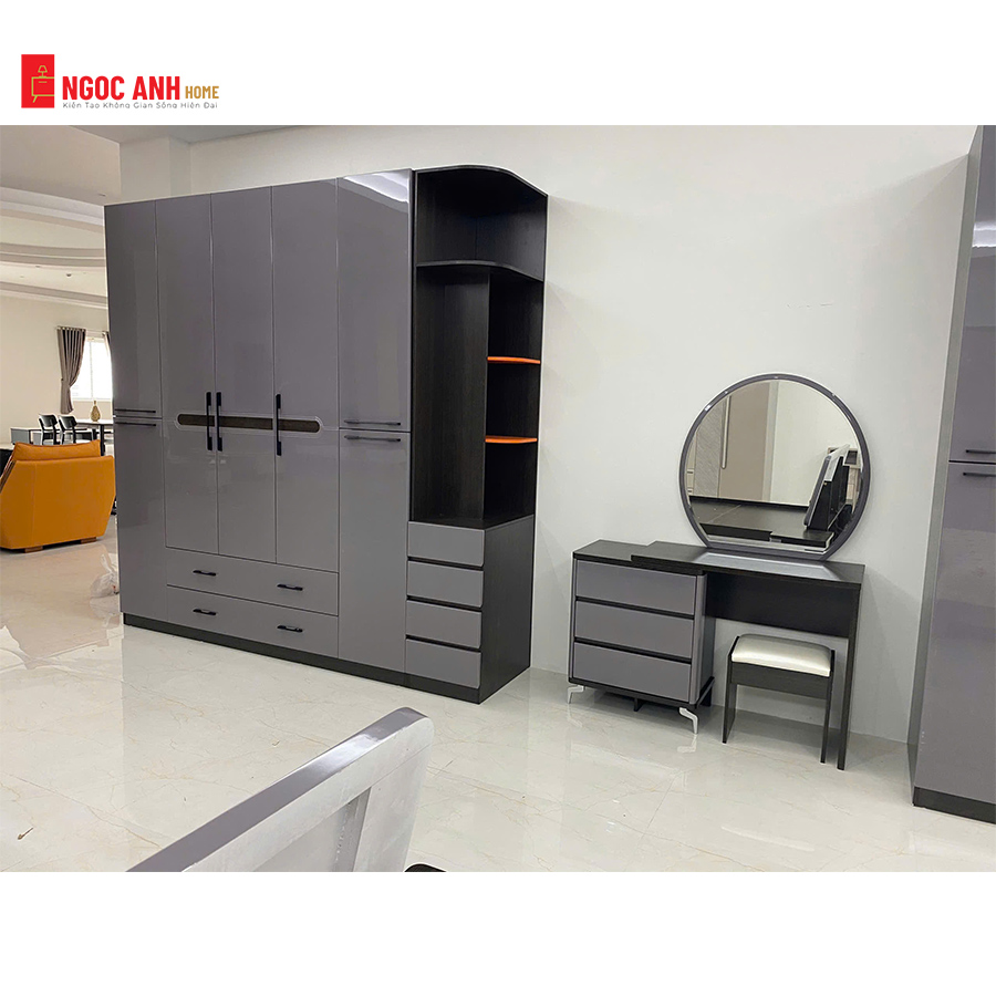 Bố Trí Khoa Học: Tủ kết hợp thông minh giữa các khoang cánh mở, hệ thống ngăn kéo phía dưới và khoang kệ hở đa năng bên cạnh. Khoang hở không chỉ tạo điểm nhấn trang trí mà còn tiện lợi để đặt sách, túi xách hay vật dụng thường xuyên sử dụng.