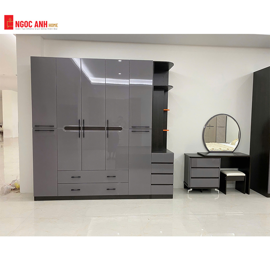 Bề Mặt Sơn Bóng Phản Chiếu: Các cánh tủ được phủ sơn bóng, không chỉ tạo vẻ ngoài hiện đại mà còn giúp căn phòng trông rộng rãi và sáng hơn.