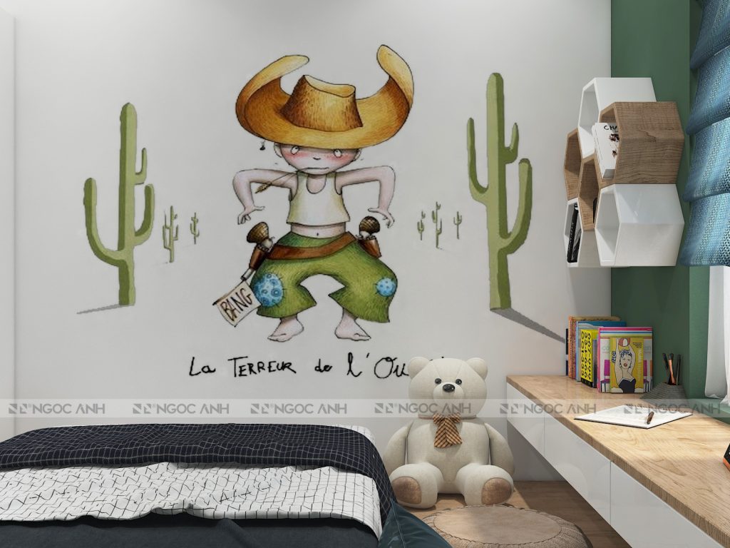 • Phòng Trẻ Em Đầy Màu Sắc: Thiết kế phòng ngủ cho trẻ cần kích thích sự sáng tạo và vui tươi bằng các gam màu nổi bật (xanh lá, xanh dương) và hình ảnh hoạt hình. Nội thất cần đảm bảo an toàn (góc bo tròn, vật liệu không độc hại).